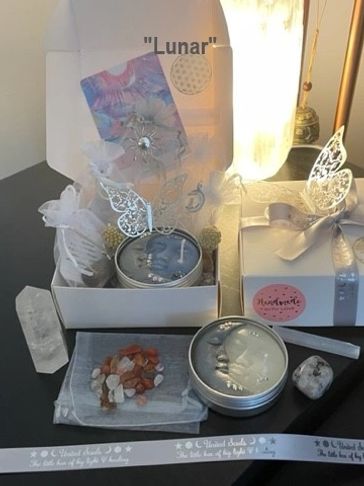 “Lunar” especially created to bring peace, balance and harmony with the moon cycles, particularly the upcoming series of Super Moons in July, August and September, but also the Super Blue Moon in August 2023. There are two handmade candles in this box, one especially to use with the August Blue Moon